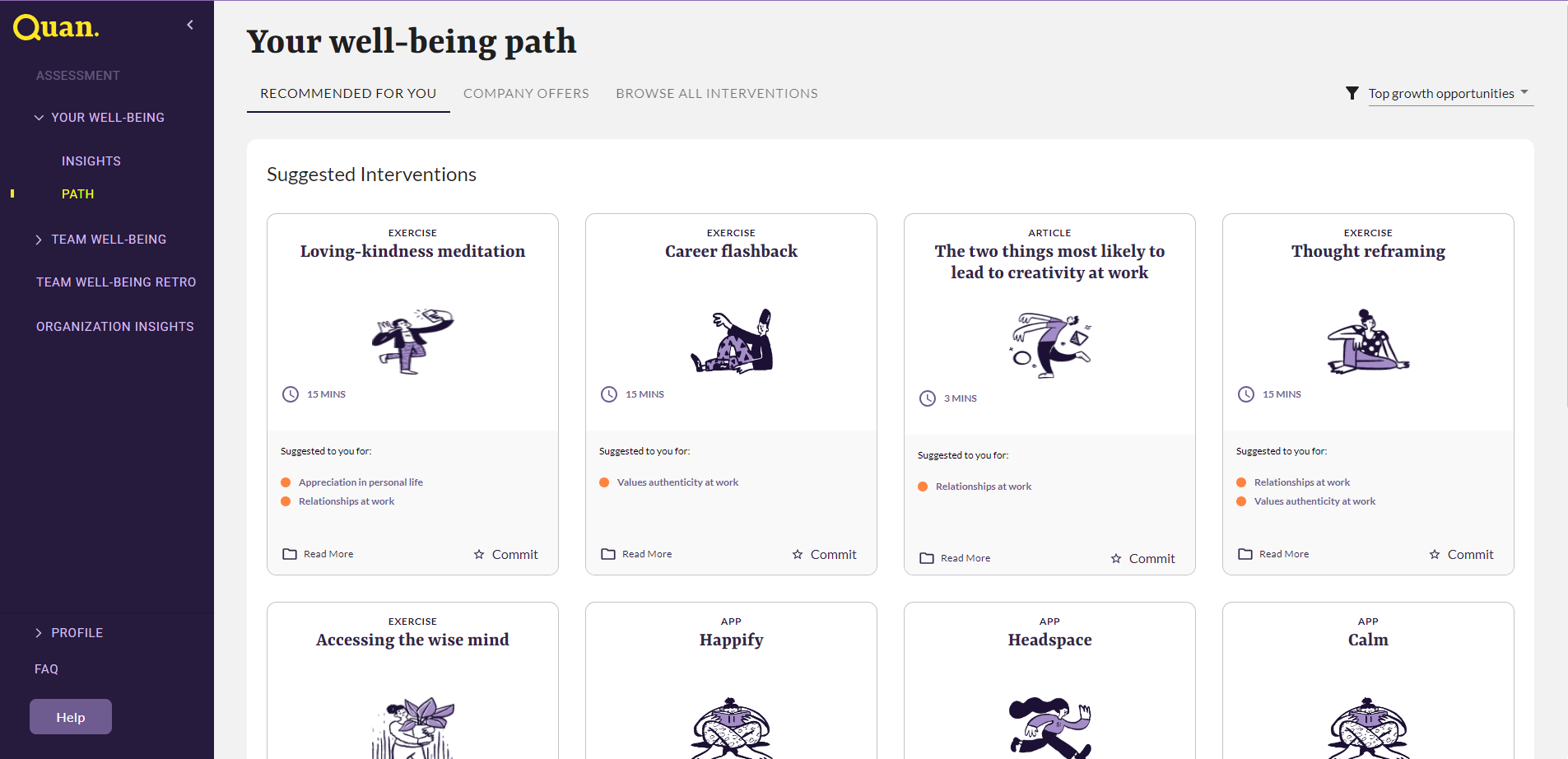 Once you have completed Quan’s Holistic Well-being Assessment, you should be able to see all Quan content under the section "Path". The content in your “Path” is tailored specifically to your well-being results. This is what it looks like: